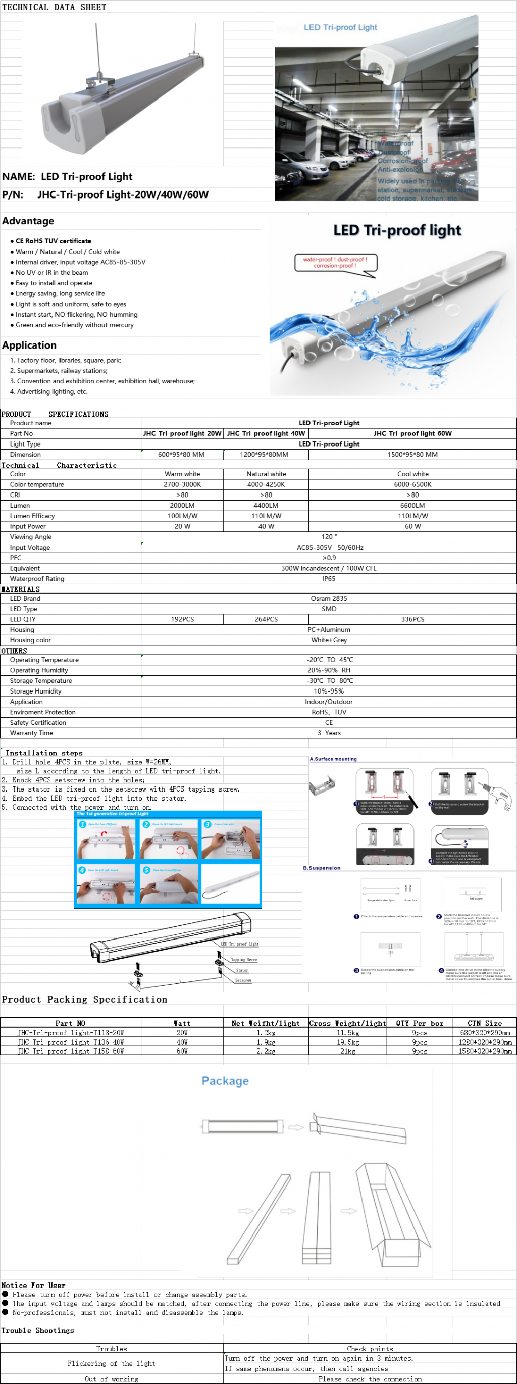 Part NO.:JHC-LED-Tri-proof Light-20W/40W/60W